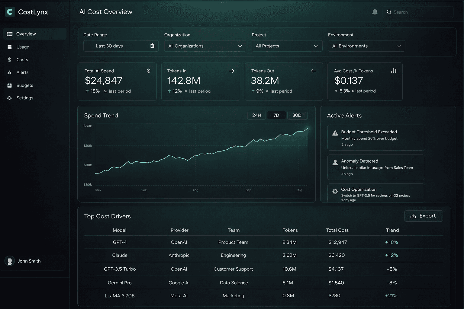 CostLynx gives engineering and finance teams the visibility they need to understand, monitor, and control AI spending.