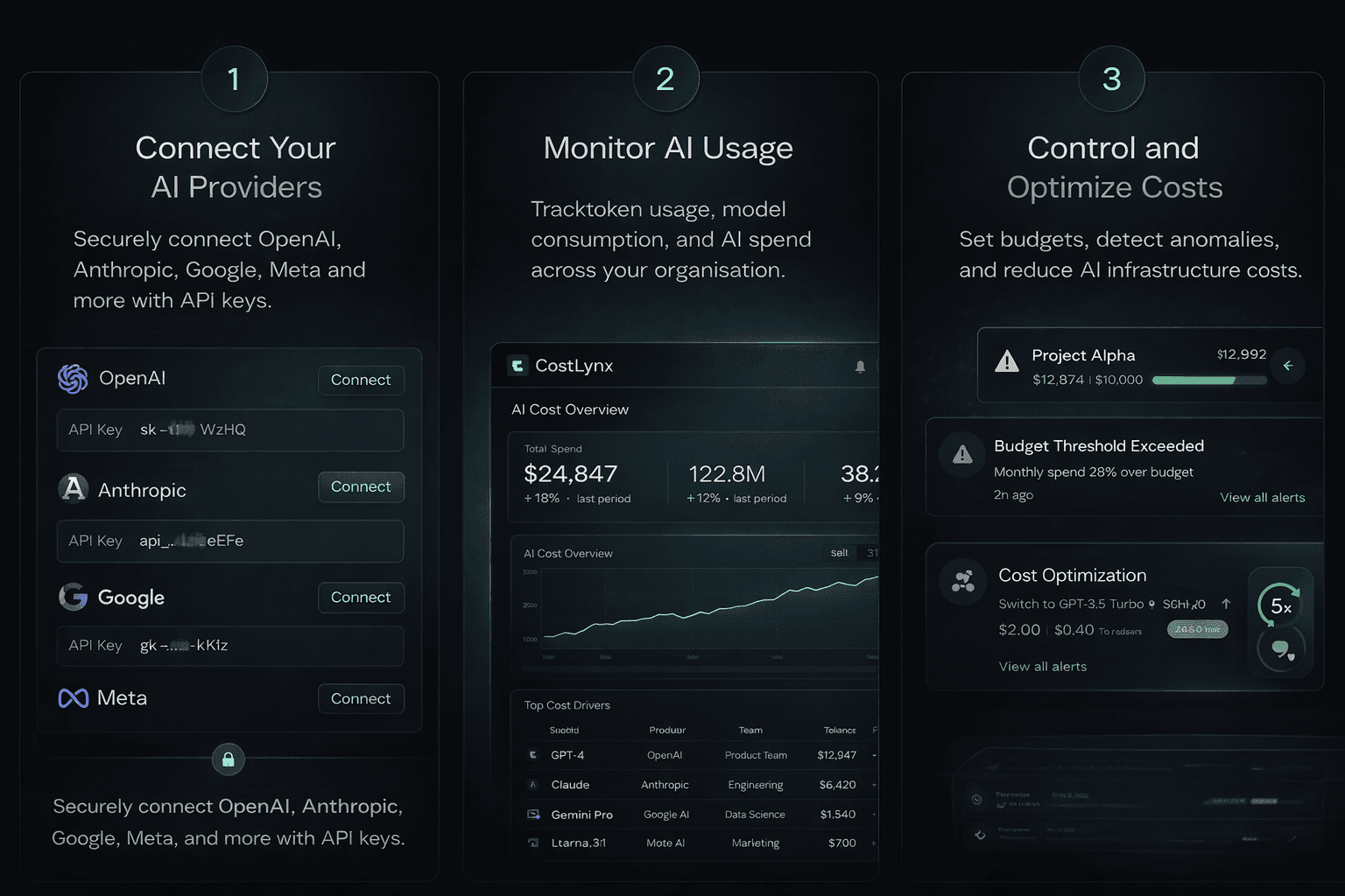 CostLynx helps teams monitor token usage, track AI spend, and detect anomalies before costs spiral out of control.